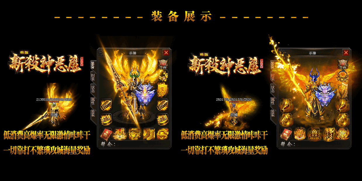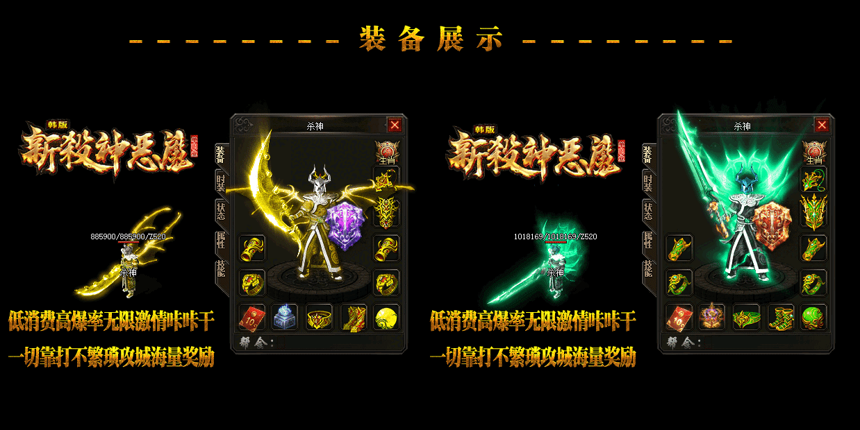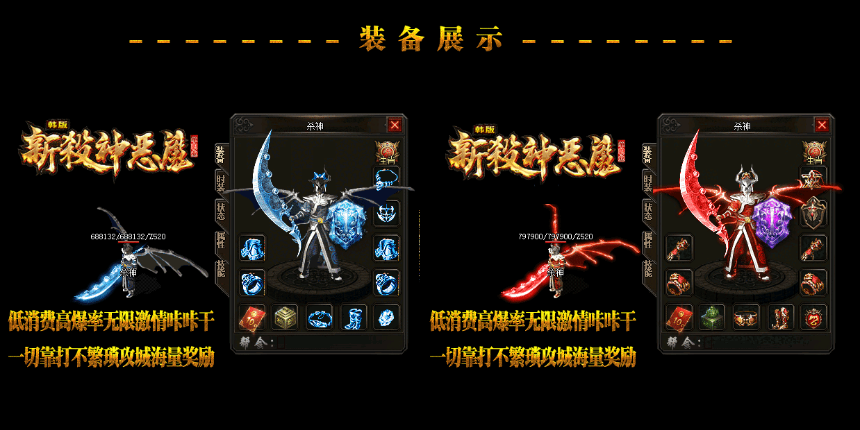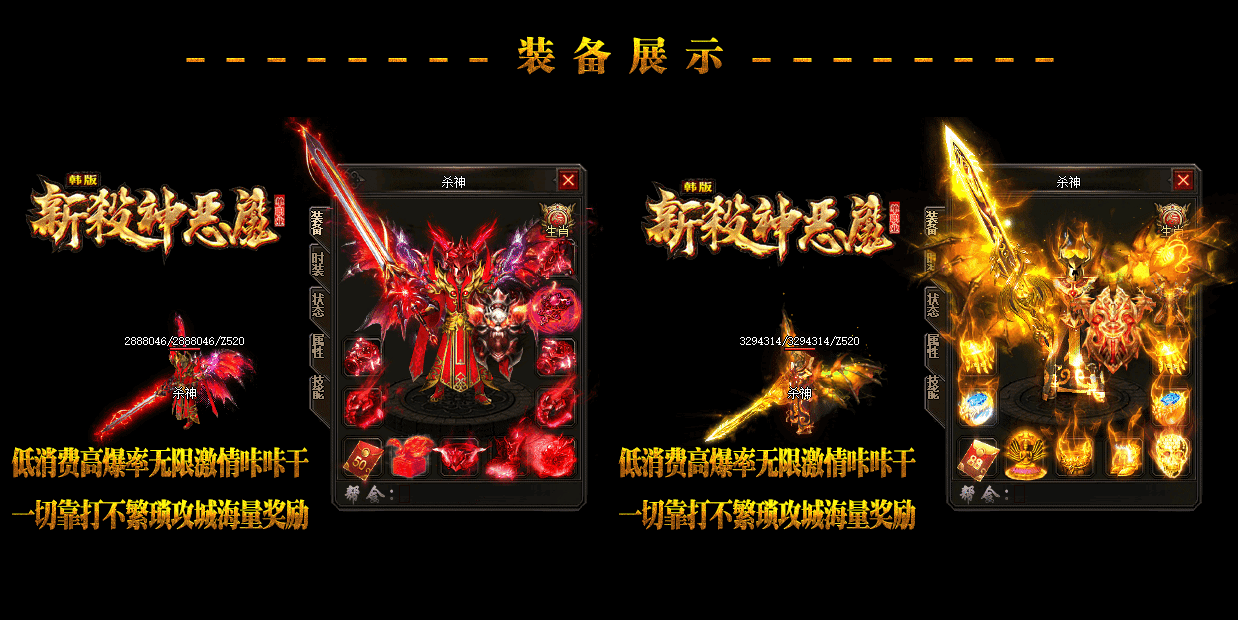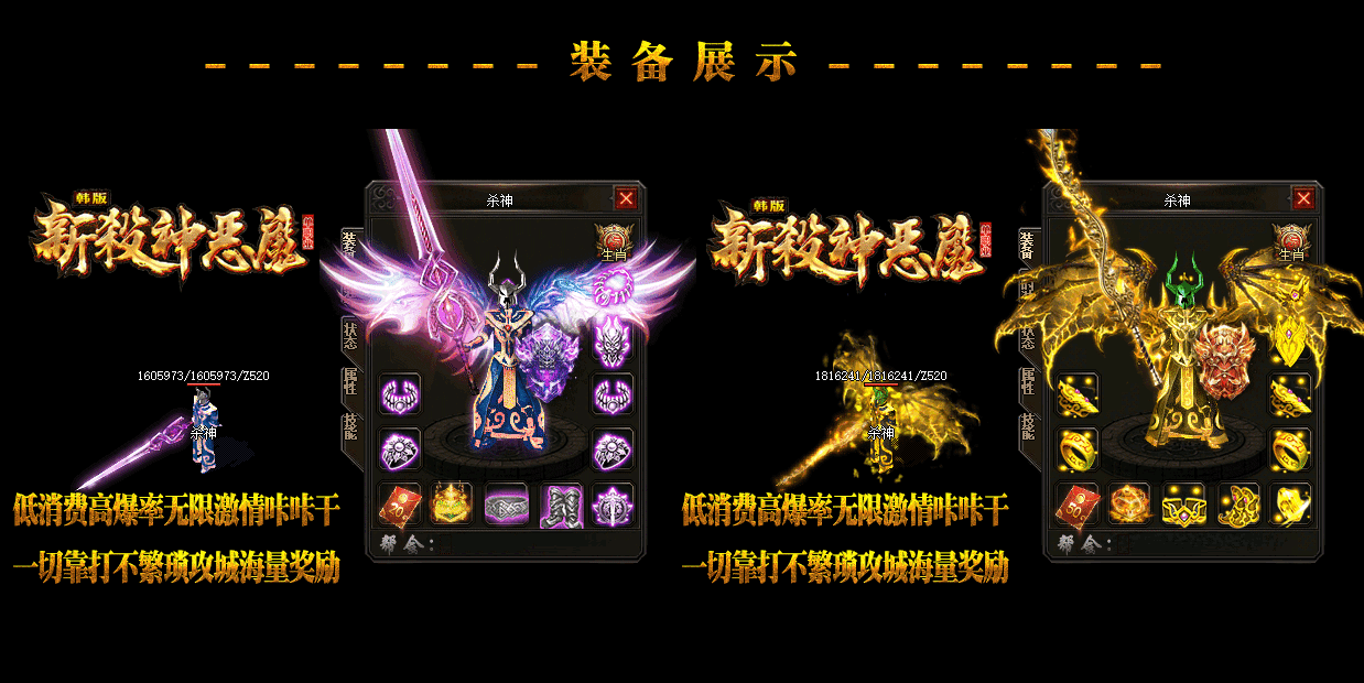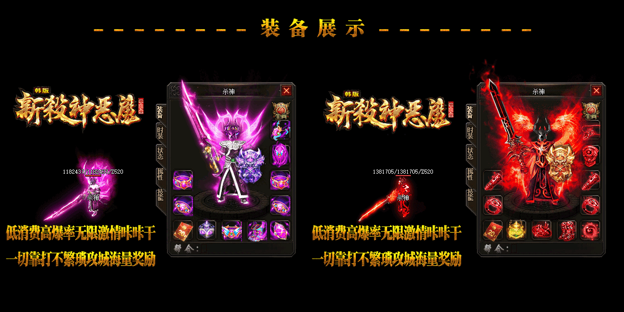 - 【装备】 所有装备全部爆出(包括终极).让玩家彻底体验打怪爆终极!